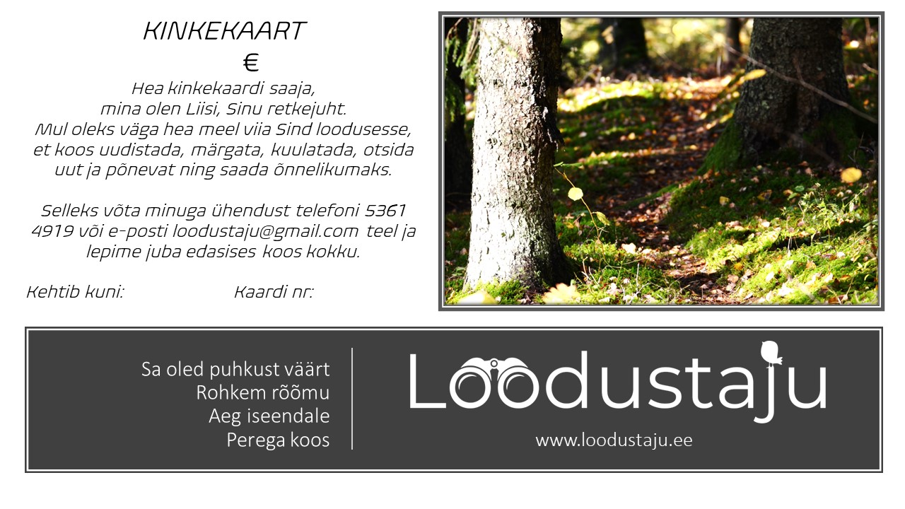 Selleks, et oma lähedasele seda pakkuda, saad soetada Loodustaju kinkekaardi. Saad valida just selle väärtusega, mis sobib sinu rahakotile või kingisaajale kõige paremini. Edasise valiku teeme juba kingisaajaga koostöös. Lisan veel juurde, et avalikel loodusretkedel algavad hinnad 25 eurost inimese kohta ning eraretkedel 180 eurost.Kinkekaarti on võimalik saata füüsilisel kujul postiga tellijale (saad lisada info aadressi kohta ), kui ka meili teel pdf-ina. Postiga saatmise puhul lisandub saatmiskulu. Kinkekaarti saab kasutada 1 aasta jooksul Lõuna- Eestis.